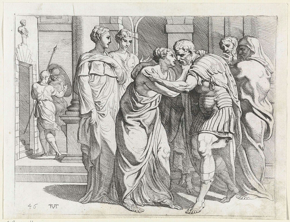 Odysseus en Penelope omhelzen elkaar