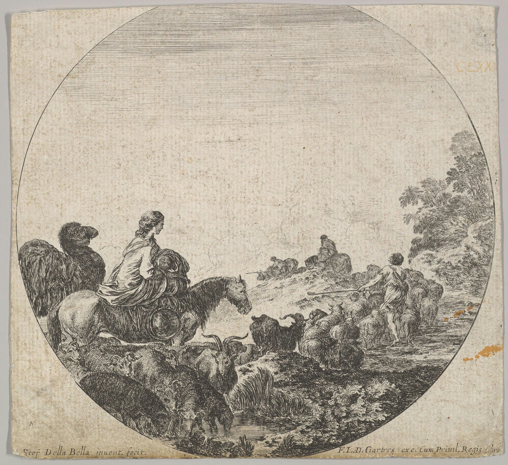 Plate 5: a woman carrying a child on a horse to left, a camel following her, a herd of goats, sheep, and a shepherd in front of her to right, a round composition, from 'Roman landscapes and ruins' (Paysages et ruines de Rome)