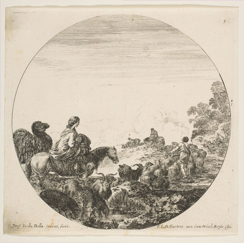 Plate 5: a woman carrying a child on a horse to left, a camel following her, a herd of goats, sheep, and a shepherd in front of her to right, a round composition, from 'Roman landscapes and ruins' (Paysages et ruines de Rome)