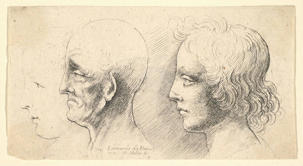 Three profile heads, one in outline only