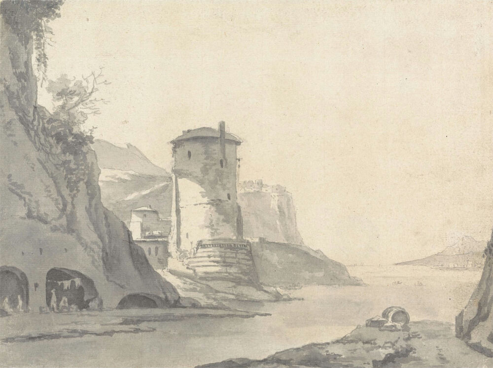 A Village in a Rocky Coastal Inlet (Italian ?) with Round Tower on the Left Bank
