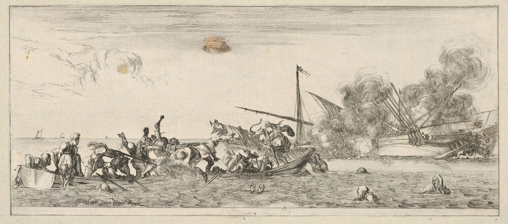 Naval battle, a rowboat filled with people fighting with muskets to left, people drowning in the sea in the center and right foreground, a ship on its side and burning in the background, from 'Peace and War' (Divers desseins tant pour la paix que pour la guerre)
