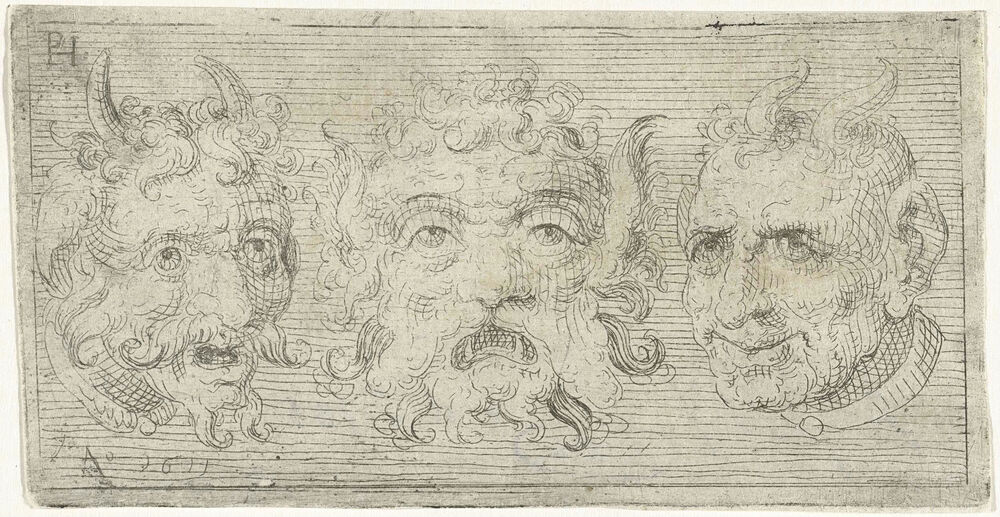 Drie maskers, waarvan twee met hoorns