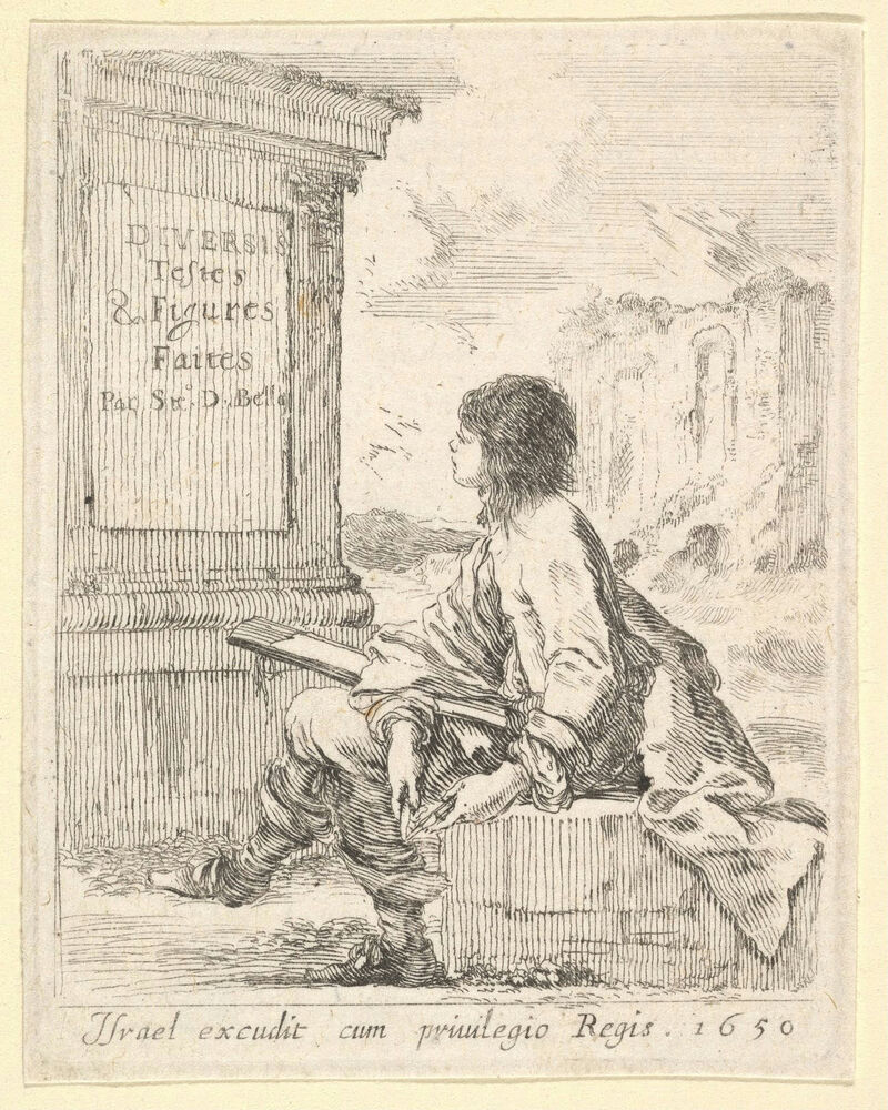 Plate 1: a young man sitting on a stone, facing left in profile, holding a drawing pad in his lap and a pen in his left hand, a pedestal with title to left and ruins to right in the background, title page from 'Various heads and figures' (Diverses têtes et figures)