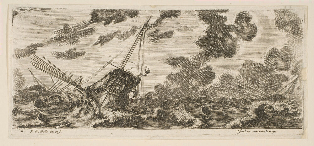 Plate 6: three ships in a storm, from 'Various Embarkations' (Divers embarquements)
