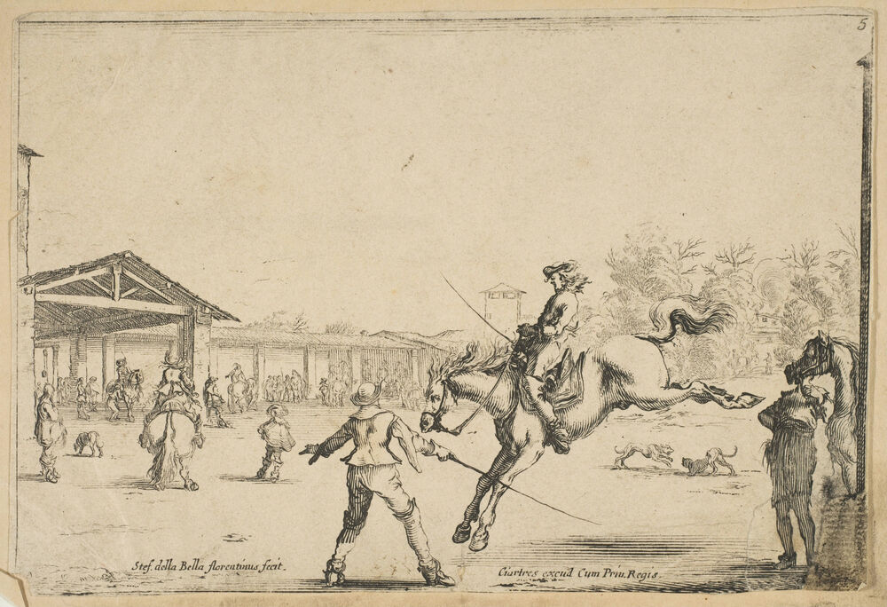 A riding school, a horseman with sword jumping directed by another man with a sword in center, a man standing next to his horse to right, various horsemen, the school, and two dogs in the background, from 'Varie figure'