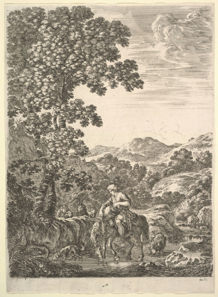 A shepherd on horseback in the middle of a stream, facing left, dogs, goats and cows follow to left and right, a large tree to left and mountains to right in the background, from 'Four large landscapes' (Quatre grands paysages en hauteur)