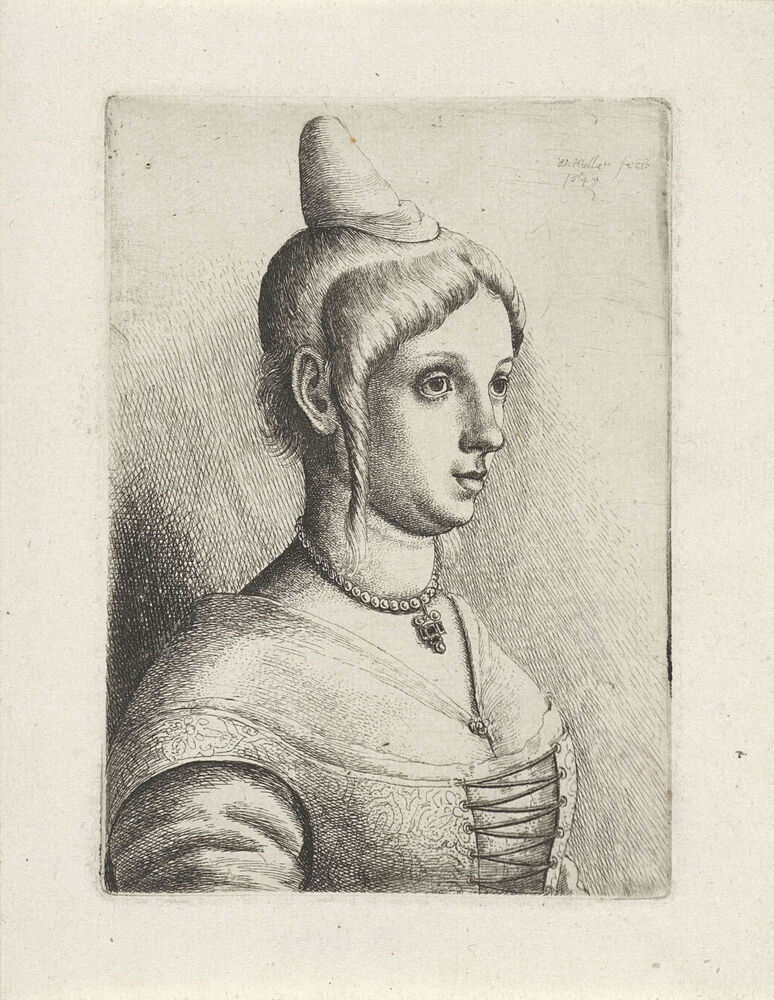 Portret van een jonge vrouw met een kegelvormig hoedje