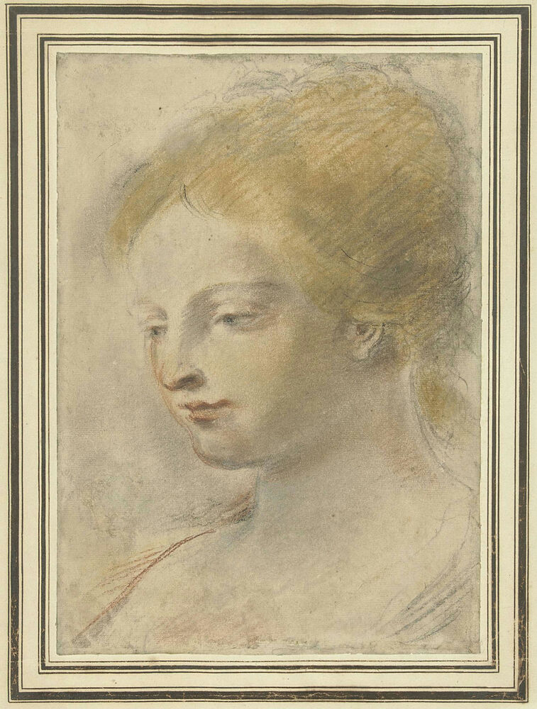 Hoofd van een jonge vrouw, met neergeslagen blik