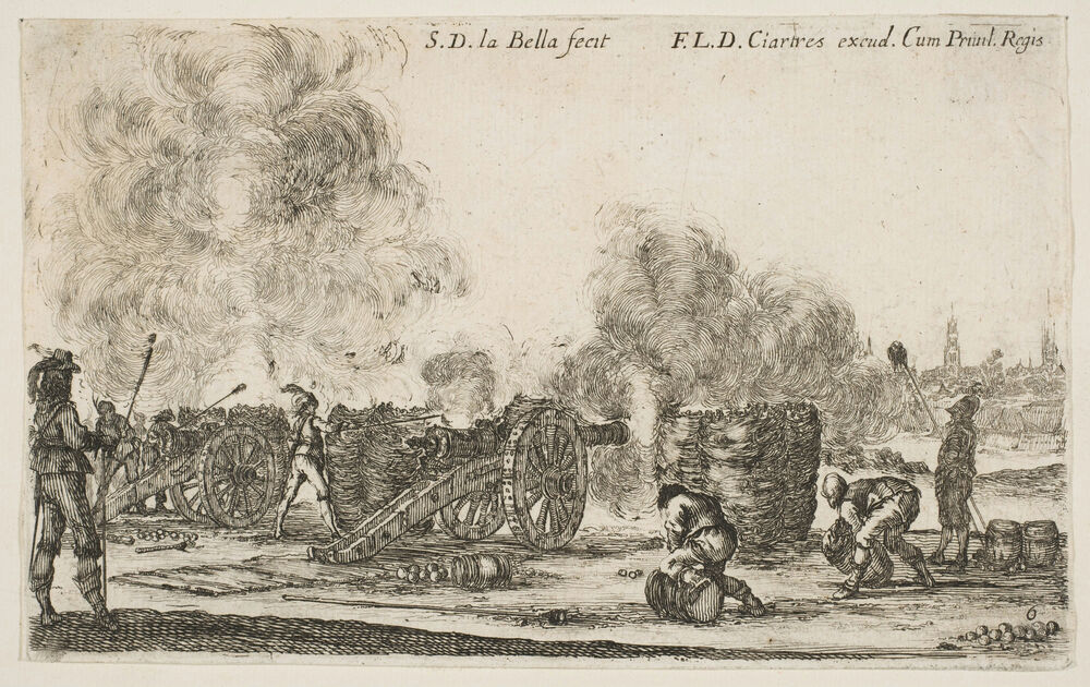 Plate 6: battery of cannons firing on a city, from 'Various Military Caprices' (Varii capricci militari)