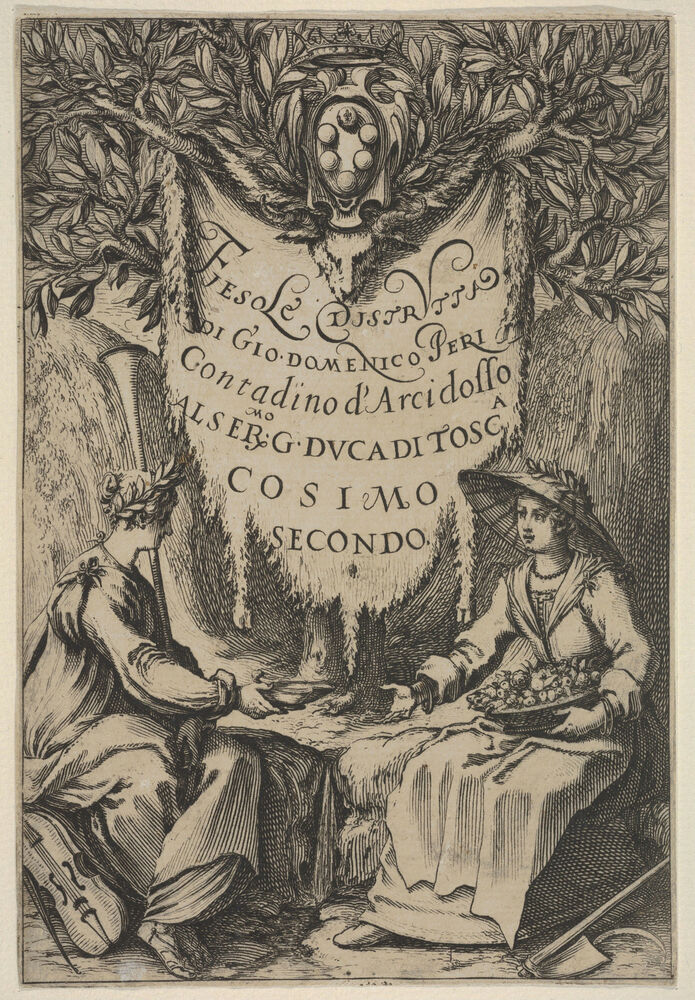 Frontispiece from 'Fiesole Destroyed' ('Fiesole Distrutta'), two seated women, one wearing a laurel wreath and the other wearing a hat crowned with laurel, with the Medici arms and the crown of the grand duchy above