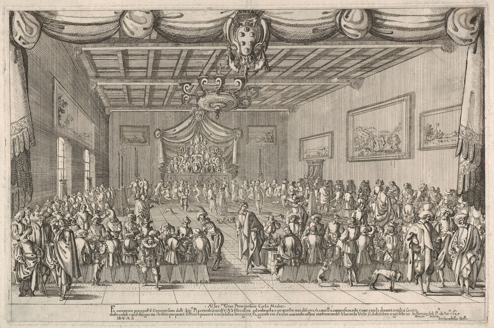 Banquet of the Piacevoli, various men are seated at long tables around the perimeter of a large room, a man seated to the right giving a dog table scraps, curtains are draped around the image, Medici coat of arms at top center