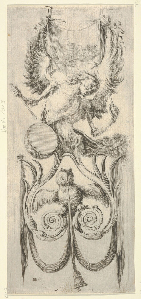 Death beating a drum above, an owl and a bell attached to a ribbon below, from 'Ornaments or Grotesques' (Ornamenti o Grottesche)