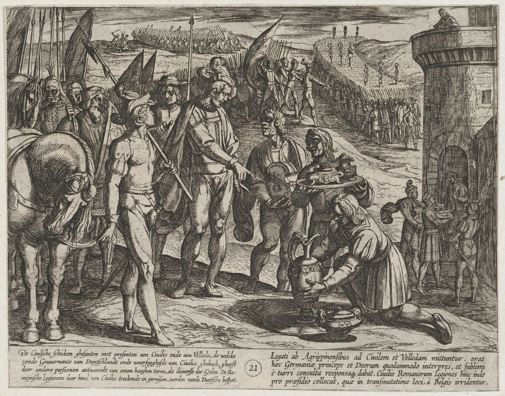Plate 21: Envoys from Cologne Bring Presents to Civilis, from The War of the Romans Against the Batavians (Romanorvm et Batavorvm societas)