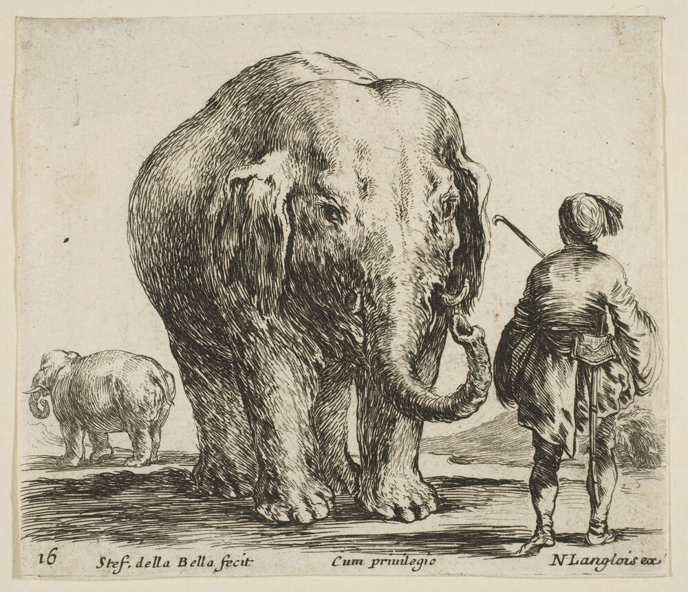 Plate 16: an elephant in center, his mahout standing to the right wearing an Oriental costume, another elephant to left in background, from 'Diversi capricci'