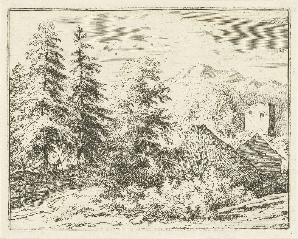 Landschap met man tussen twee sparren