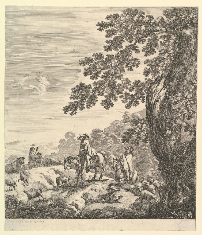 Two horsemen pass a flock, riding towards the left, a peasant woman and a young boy to left in the middleground, a large tree to right, from 'Six large views, four of Rome and two of the Roman countryside' (Six grandes vues, dont quatre de Rome et deux de la Campagne romaine)