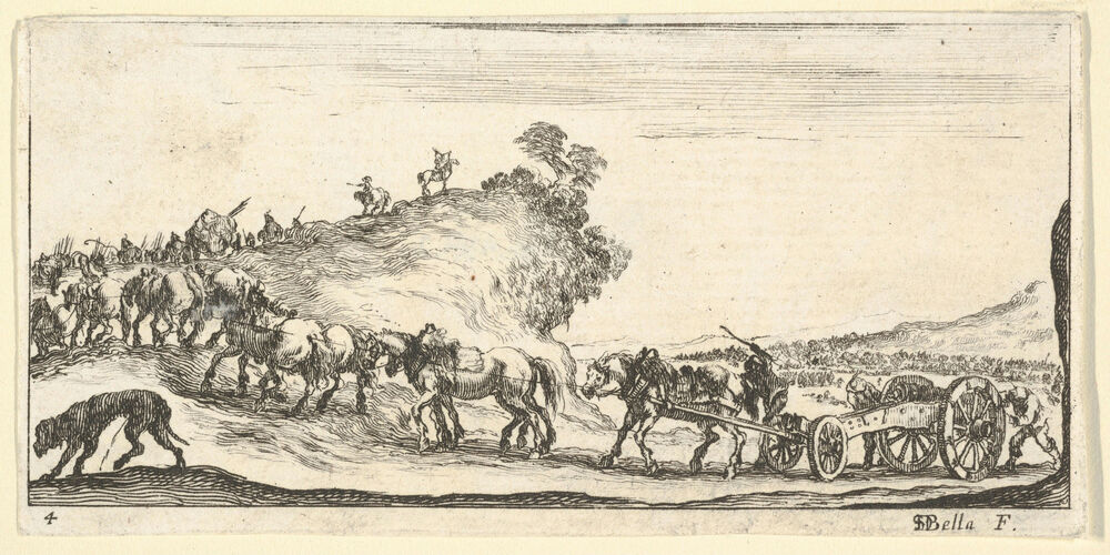 Plate 4: a procession of cannons and horses riding uphill towards the left, a dog at lower left, from Dessins de quelques conduites de troupes