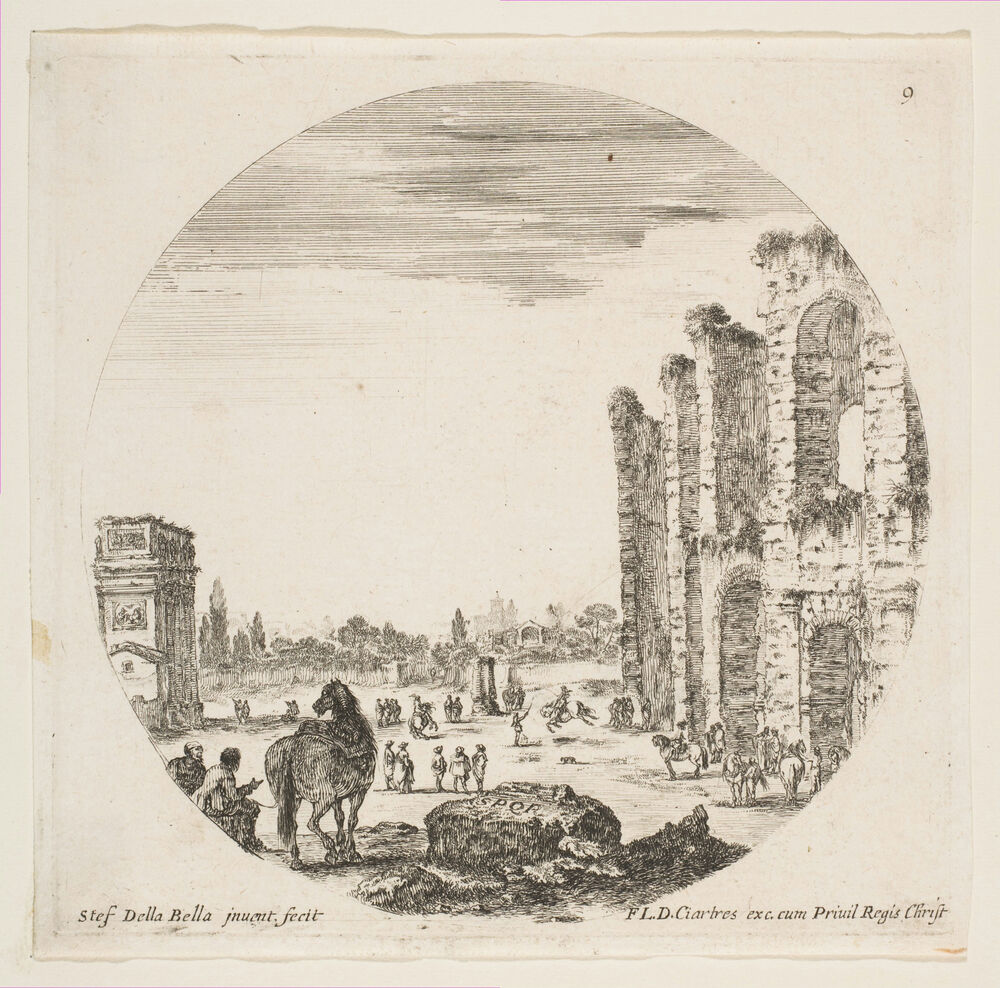 Plate 9: the Arch of Constantine to left, seen from the side, part of the Colosseum to right, various horses and figures in foreground and background, a round composition, from 'Roman landscapes and ruins' (Paysages et ruines de Rome)
