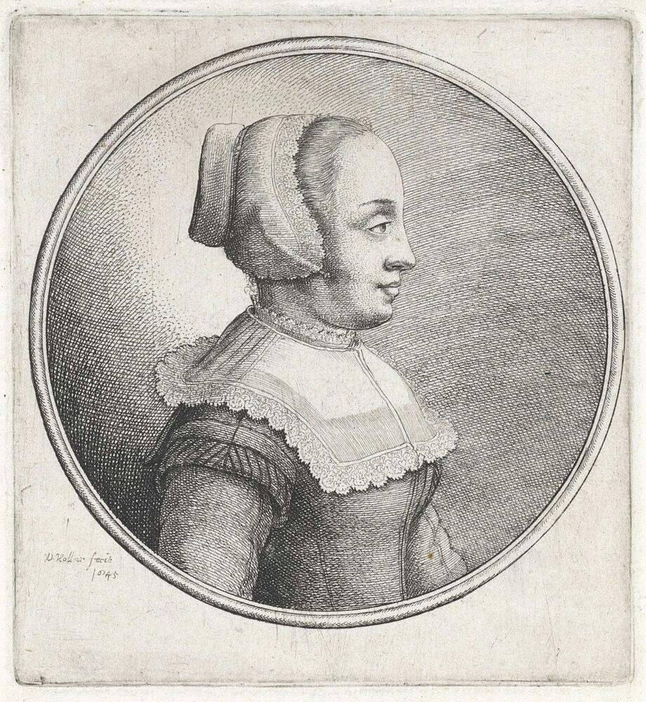 Vrouw met kanten hoofdkapje en vierkante kraag