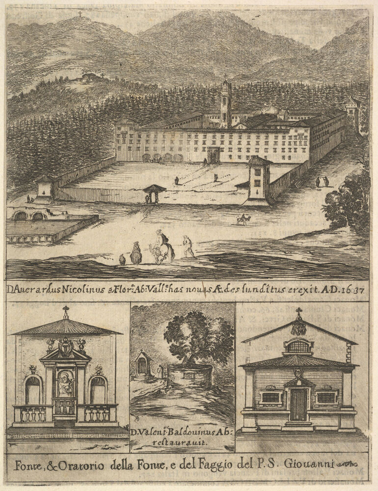 Four views: at top, a view of the new monastery of Vallombrosa, at bottom left and right, a view of a chapel, at bottom center, the tree of St. John Gualbert, from 'Frontispiece and four scenes from the life of Saint John Gualbert' (Frontispice et quatre vignettes pour une vie de Saint Jean Gualbert)