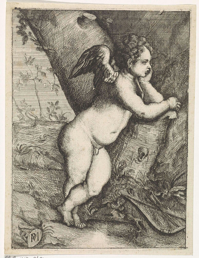 Amor mijmerend bij een boomstam