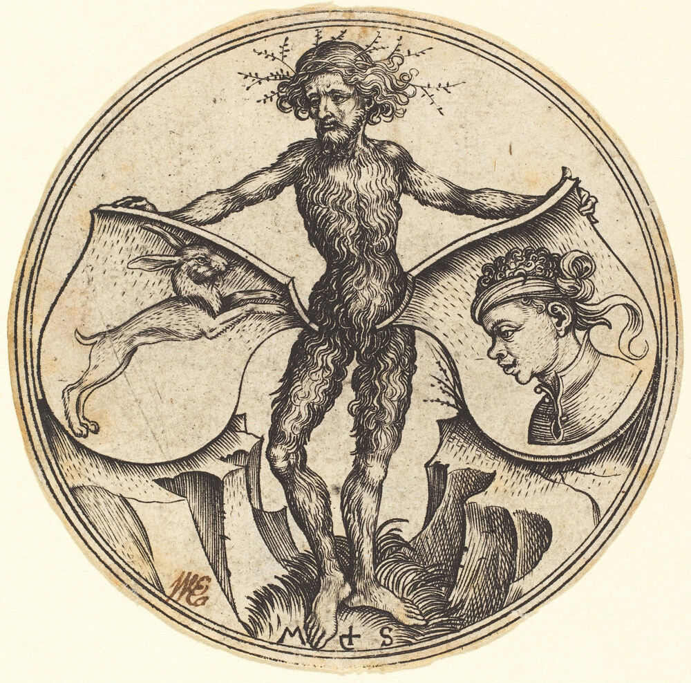 Shields with Rabbit and Moor's Head, Held by Wild Man