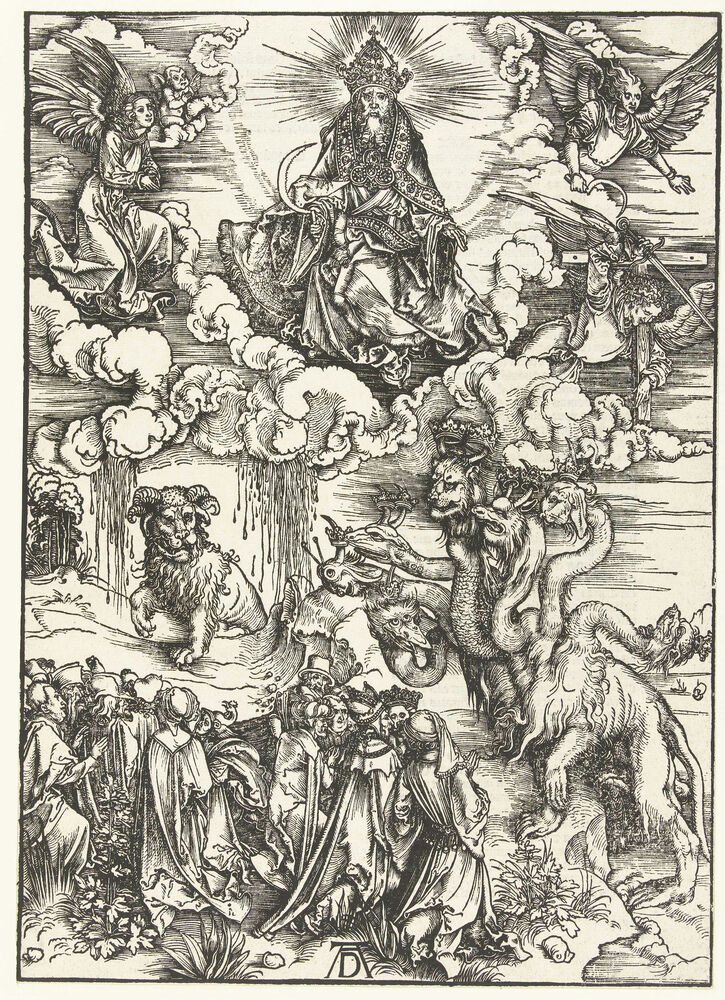 Christus met een sikkel, het beest met de hoorns als van een lam en de zevenkoppige draak