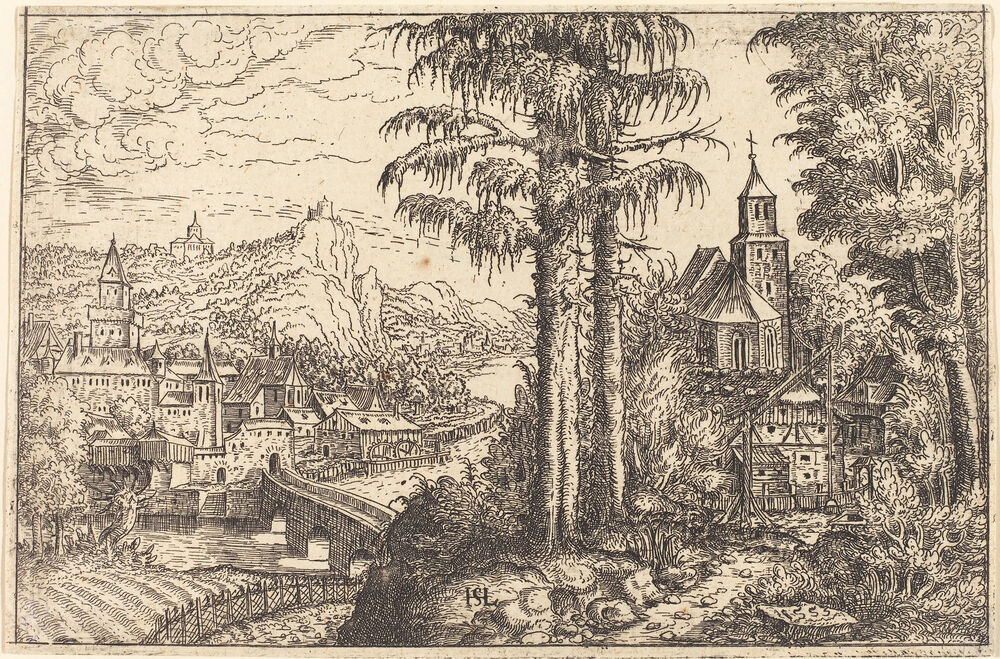 View of a Town near a River with a Church on the Right