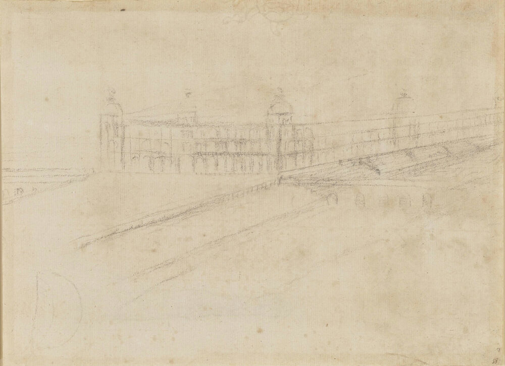 Recto: A horse's fore-leg and chest. Verso: A design for a palace