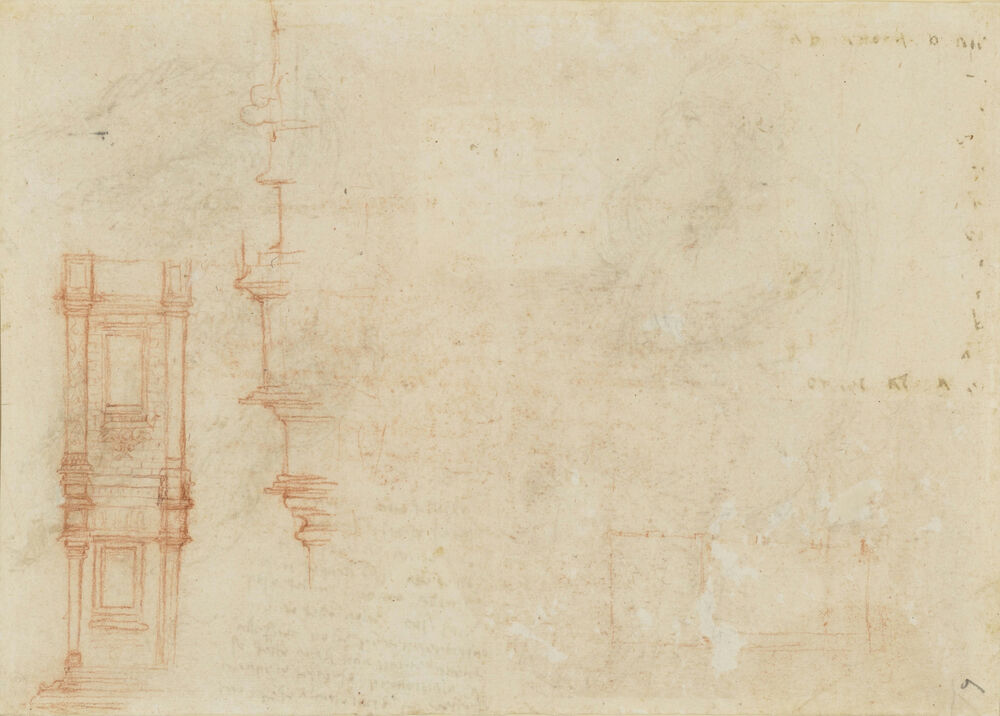 Recto: Studies of water, and a seated old man. Verso: Architectural studies