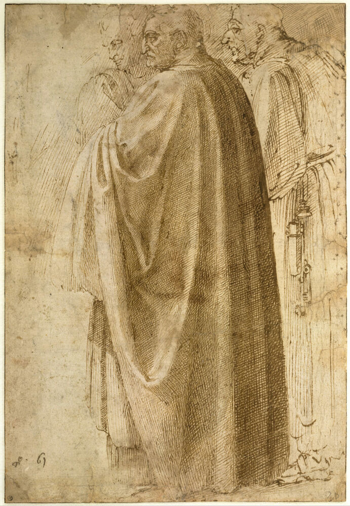 Three Standing Men in Wide Cloaks Turned to the Left (recto), c. 1492-1496