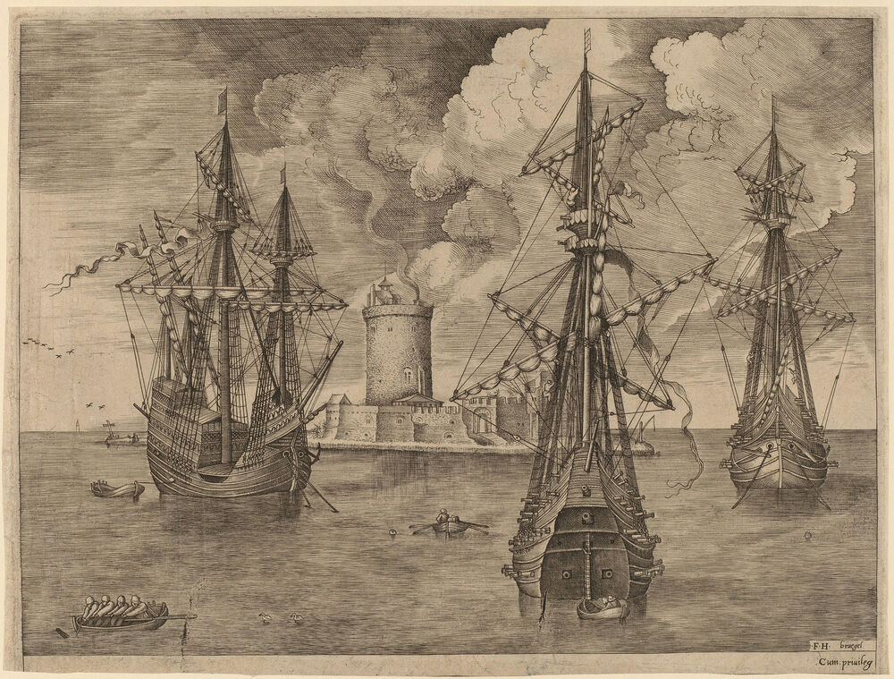 Four-Master (Left) and Two Three-Masters Anchored near a Fortified Island with a Lighthouse