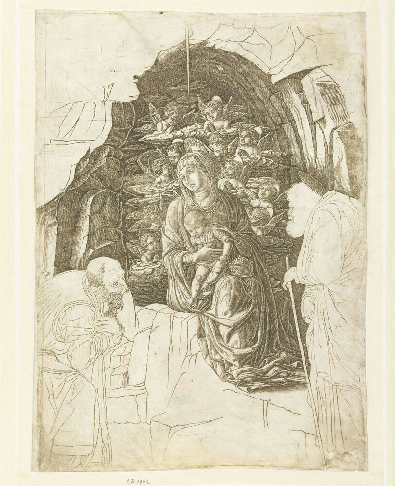Maria met kind omgeven door engelen in grot met Jozef en koning in aanbidding