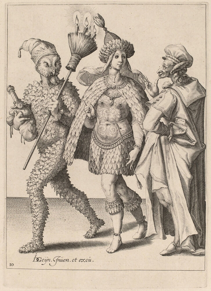 An Old Mummer Addressing a Couple Dressed in Feathers