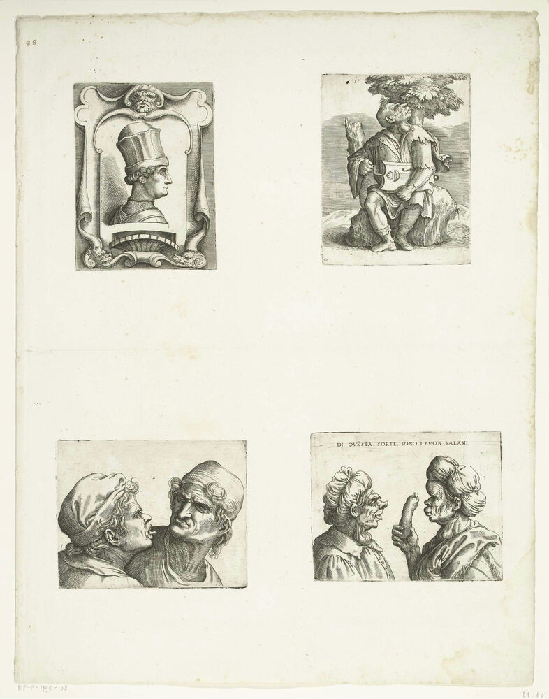 Francesco Sforza, Hurdy-Gurdy Player, Caricature of Two Men’s Heads, Caricature of Two Old Women with a Salami