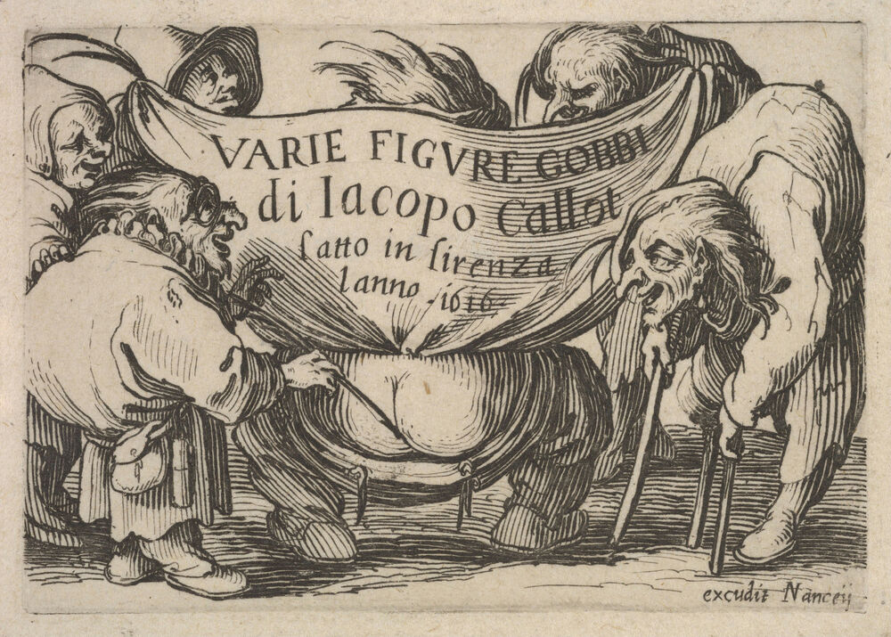 Title page, Varie figure gobbi by Jacques Callot, a squatting figure with bare buttocks surrounded by two figures holding the inscribed drapery and three other figures