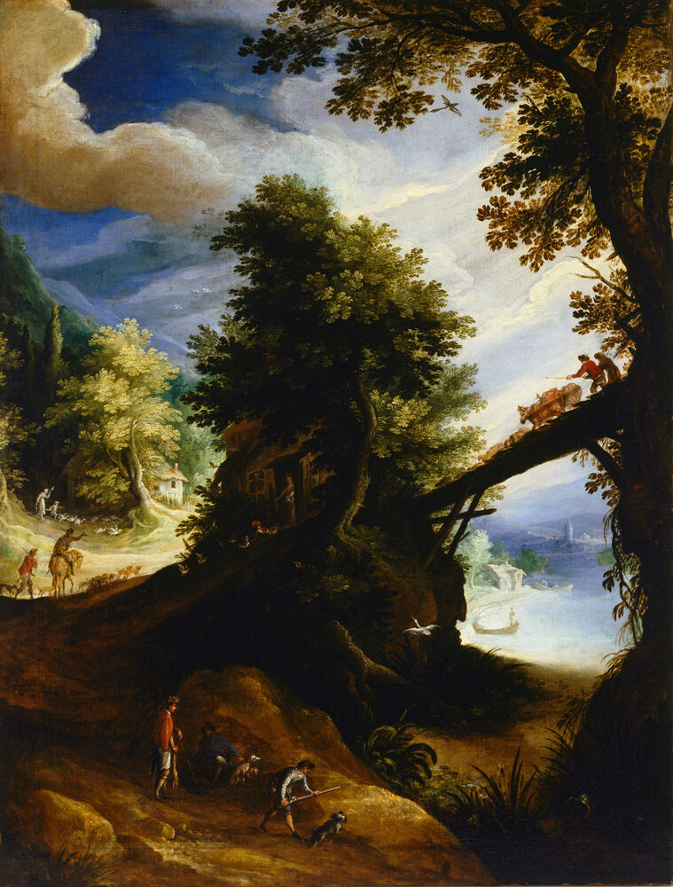 A wooded landscape with a bridge and sportsmen at the edge of the river