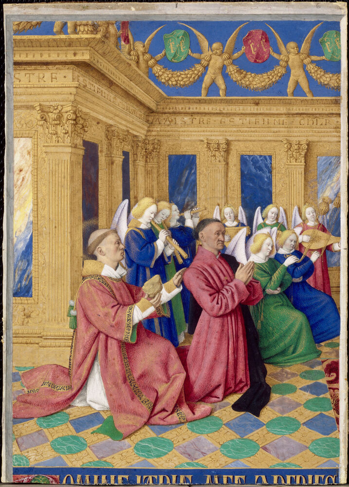 Heures d'Etienne Chevalier, n° 201 et N° 202 : Etienne Chevalier présenté par saint Etienne à la Vierge et à l’Enfant