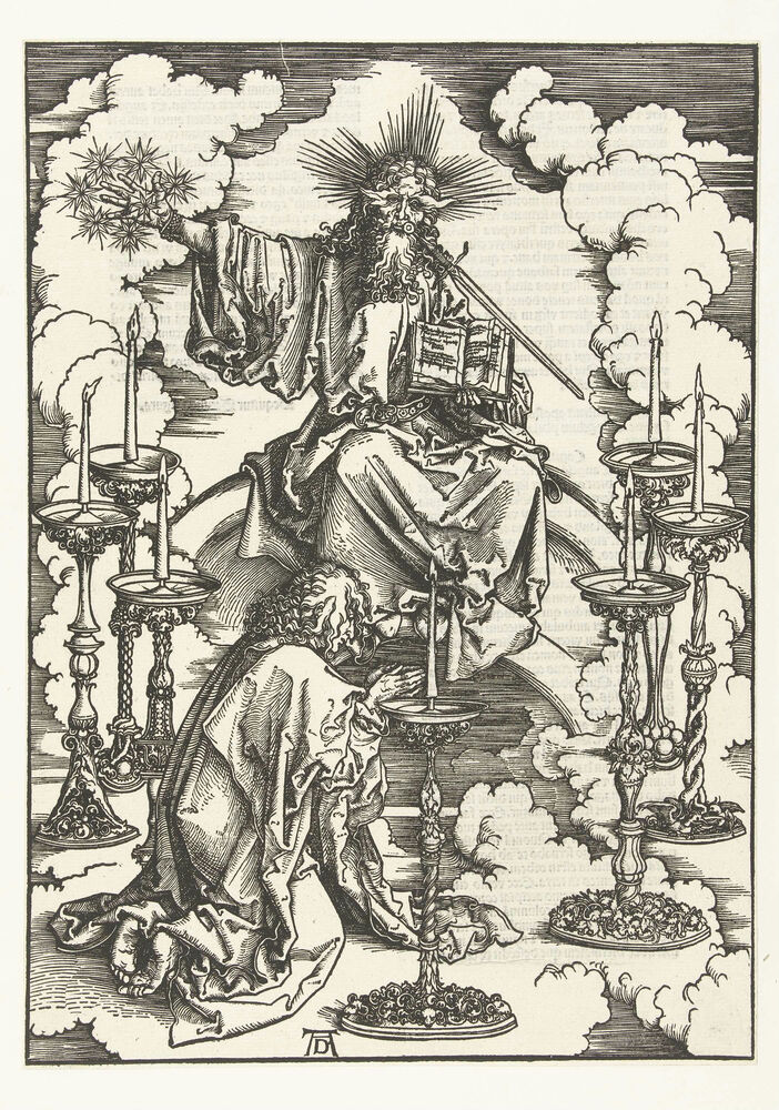 Johannes de Evangelist knielt voor Christus temidden van zeven kandelaars