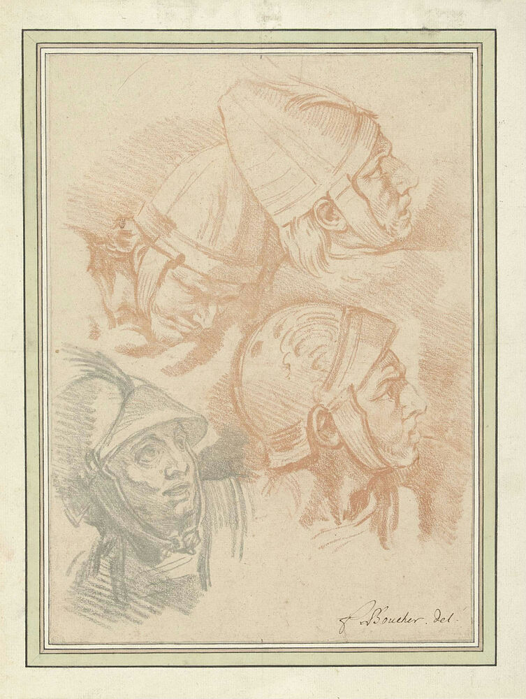 Study sheet with four soldiers' heads, after the Column of Trajan (design for a plate in ''Recueil de différents caractères des testes dessinées d'apres la Colonne Trajane'', etched by J.B. Hutin, published by Gabriel Huquier)