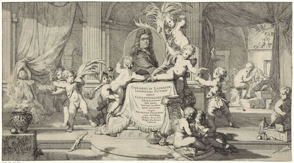 Portret van Gerard de Lairesse door putti versierd