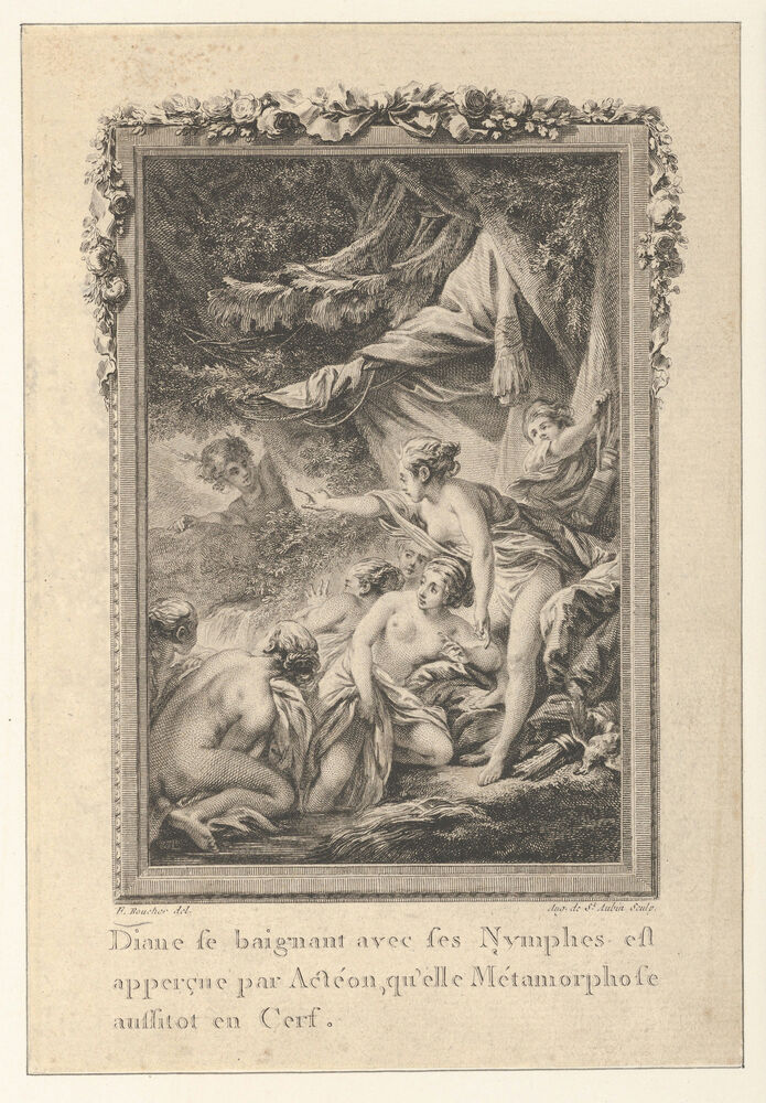 Vignette (Tome 1.er, page 200, lib. III, fab. 3), depicting Diana Turning Actaeon into a Stag, from Les Métamorphoses d'Ovide en Latin et en François de la traduction de M. l'Abbé Banier de l'Académie Royale des Inscriptions et Belles-Lettres. Avec des explications historiques. A Paris Chez Despilly rue saint Jacques à la croix d'or. MDCCLXVII. Avec Approbation et Privilège du Roi
