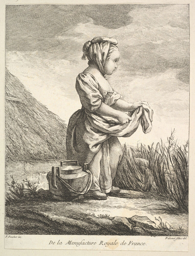 Little girl with a vessel by her feet, from Premier Livre de Figures d'après les porcelaines de la Manufacture Royale de France, inventées en 1757, par Mr. Boucher (First Book of Figures after porcelains from the Manufacture Royale de France, devised in 1757, by Mr. Boucher)
