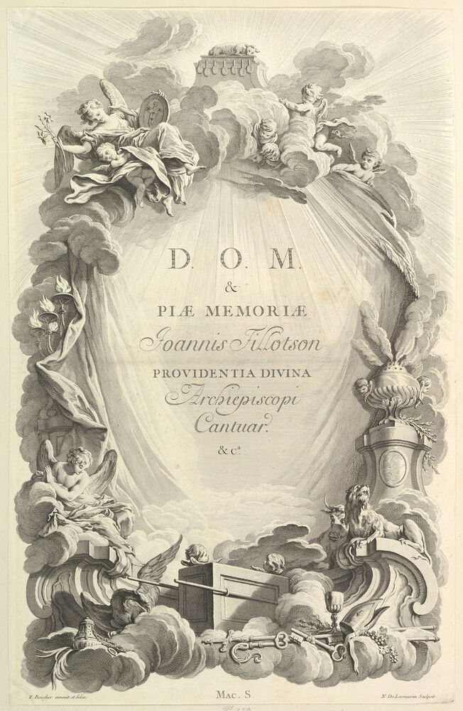 Frontispice pour le "Tombeau de John Tillotson, archevêque de Cantorbéry" (Frontispiece for the "Tomb of John Tillotson, Archbishop fo Canterbery), from Tombeaux des Princes, des Grands Capitaines et autres Hommes illustres (Tombs of Princes, Great Captains, and other Illustrious Men)