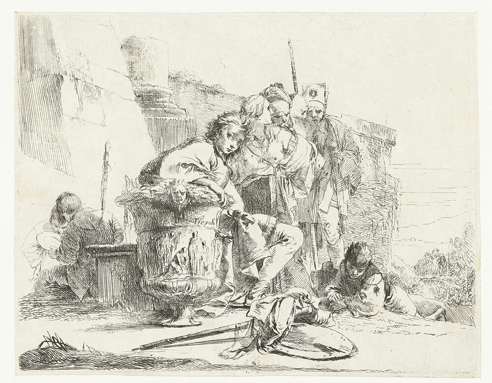 Boy Sitting next to a Vase with some Other People