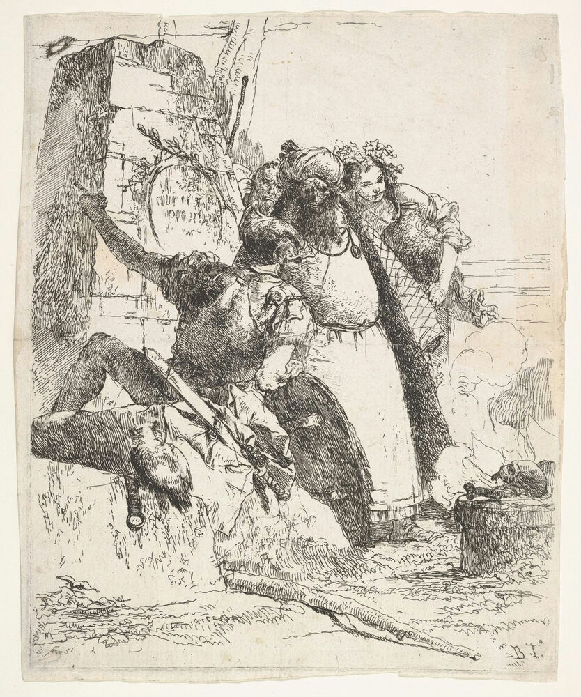 A scene of necromancy: a woman bearing a vessel, a turbaned man, and a soldier look toward a pedestal upon which a skull and limb bone are burning, a bearded male figure's face is visible behind the group, from the series 'Turns of fantasy' (Scherzi di fantasia)