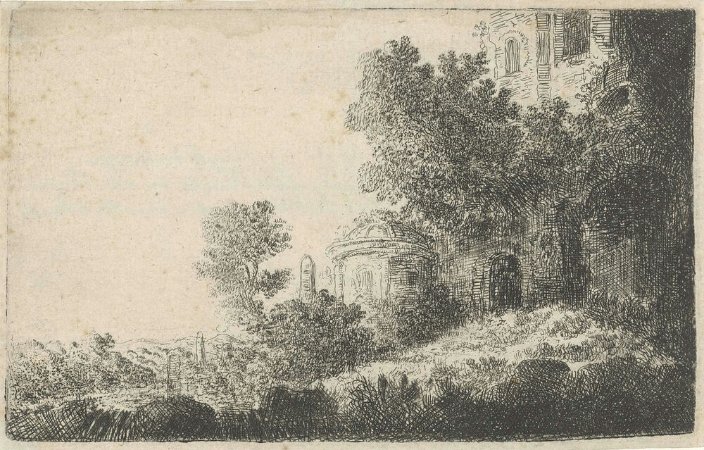 Landschap met rechts gebouwen tussen bomen