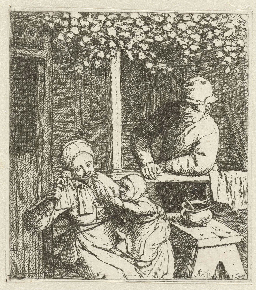 Moeder met kind op schoot dat de hand uitsteekt naar een pop, een man kijkt toe