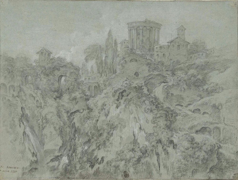 Gezicht op de watervallen bij Tivoli met de tempel van de Sybille